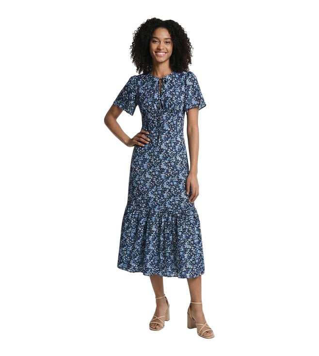 Navy Smock Neck Textured Midi Dress