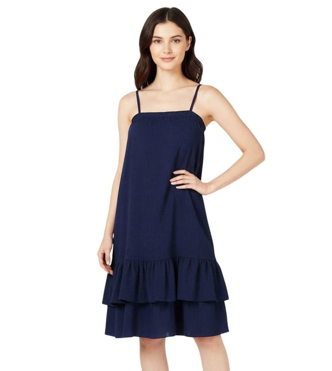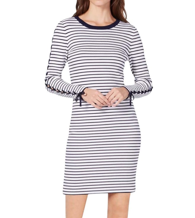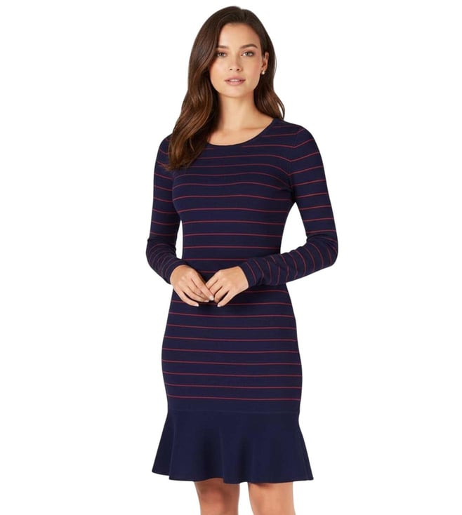 Navy Blue Striped Ruffled Sweater Dress