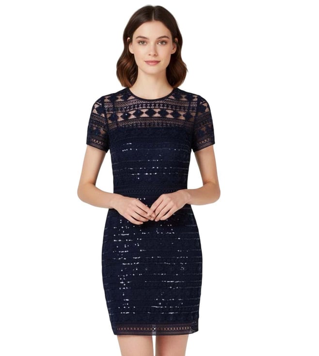 Navy Blue Sequined Lace Sheath Dress
