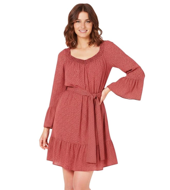 Light Brown Smock Neck Printed Ruffled Dress