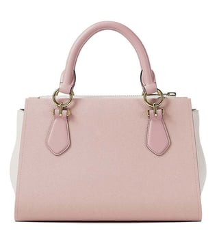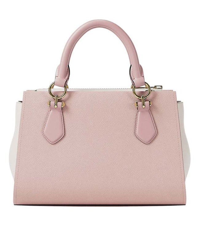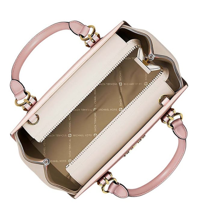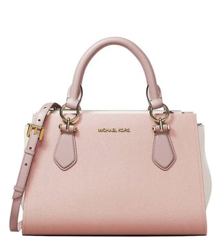 Michael Kors dusty pink marilyn colorblock small satchel crafted in saffiano leather featuring zip closure, 1 compartment, inside slip pocket, metal logo, dual carry handles with adjustable crossbody strap.