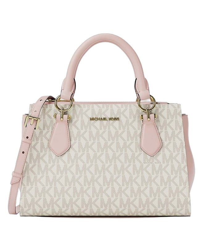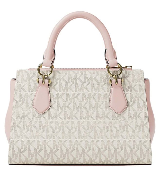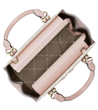 Michael Kors Dusty Pink Marilyn Small Satchel crafted in coated canvas and polyester featuring zip closure, 1 compartment, inside pocket, metal logo, dual carry handles with removable adjustable crossbody strap. Products purchased from Darveys are supported exclusively by the warranty/exchange policies of Darveys and its partner boutiques. Brand owners and their channel partners are not responsible for exchange/warranty services for items purchased through Darveys.