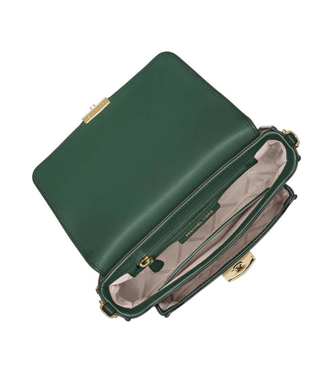 Michael Kors Green Bradshaw Medium Crossbody Bag crafted in leather featuring kiss lock closure, 1 compartment, interior slip pocket and zip pocket, front logo, removable adjustable crossbody strap. Products purchased from Darveys are supported exclusively by the warranty/exchange policies of Darveys and its partner boutiques. Brand owners and their channel partners are not responsible for exchange/warranty services for items purchased through Darveys.