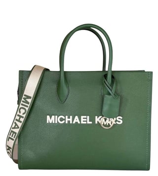 Michael Kors green mirella medium satchel crafted in leather featuring open top, 1 compartment, inside zip pocket, front logo, dual carry handles with removable shoulder strap.