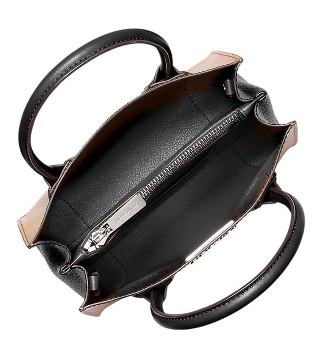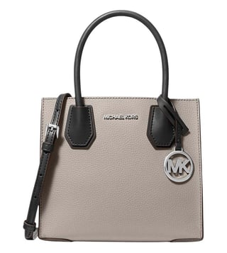 Michael Kors grey mercer medium satchel crafted in leather featuring open top, 2 compartments, center zip compartment, logo detailing, dual carry handles with adjustable removable shoulder strap.