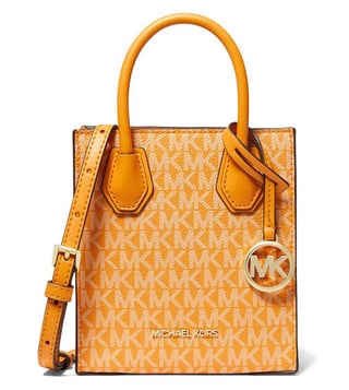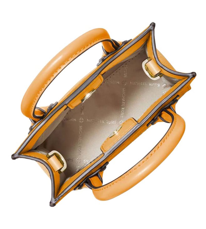 Michael Kors yellow mercer mini satchel bag crafted in leather featuring snap closure, 1 compartment, interior slip pockets, front logo, dual carry handles, adjustable satchel strap.