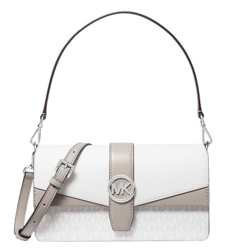 Michael Kors white greenwich convertible medium shoulder bag crafted in coated canvas and polyester featuring snap closure, 1 compartment, inside back zip pocket, outside slip pocket, metal logo, top handle with removable adjustable crossbody strap. Products purchased from Darveys are supported exclusively by the warranty/exchange policies of Darveys and its partner boutiques. Brand owners and their channel partners are not responsible for exchange/warranty services for items purchased through Darveys.