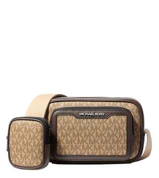 Michael Kors light brown cooper large crossbody bag crafted in coated canvas and polyester featuring zip closure, 1 compartment, inside slip pockets, outside zip pocket, metal logo, adjustable crossbody strap. Products purchased from Darveys are supported exclusively by the warranty/exchange policies of Darveys and its partner boutiques. Brand owners and their channel partners are not responsible for exchange/warranty services for items purchased through Darveys.