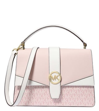 Michael Kors Light Pink Greenwich Medium Satchel crafted in coated canvas and polyester featuring snap closure, 1 compartment, inside slip pocket and 3 card slots, outside slip pocket, metal logo, top handle with removable crossbody strap.