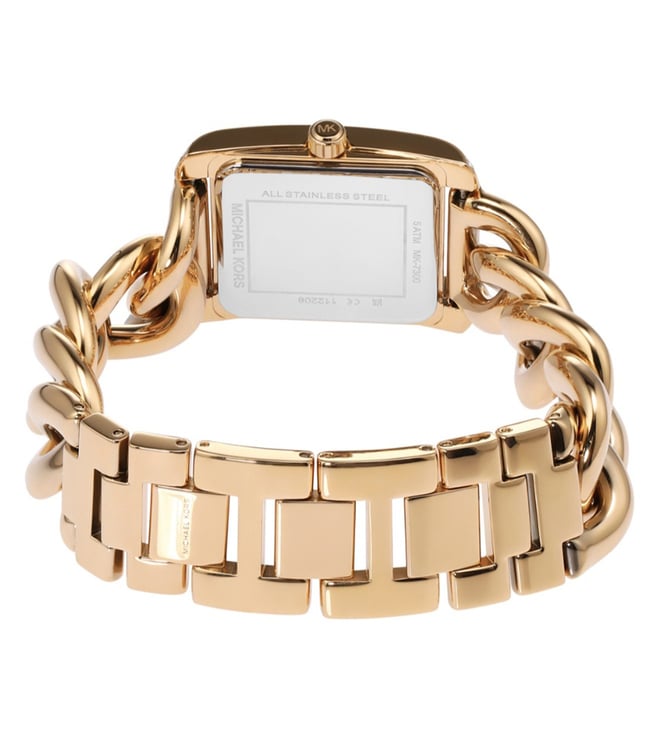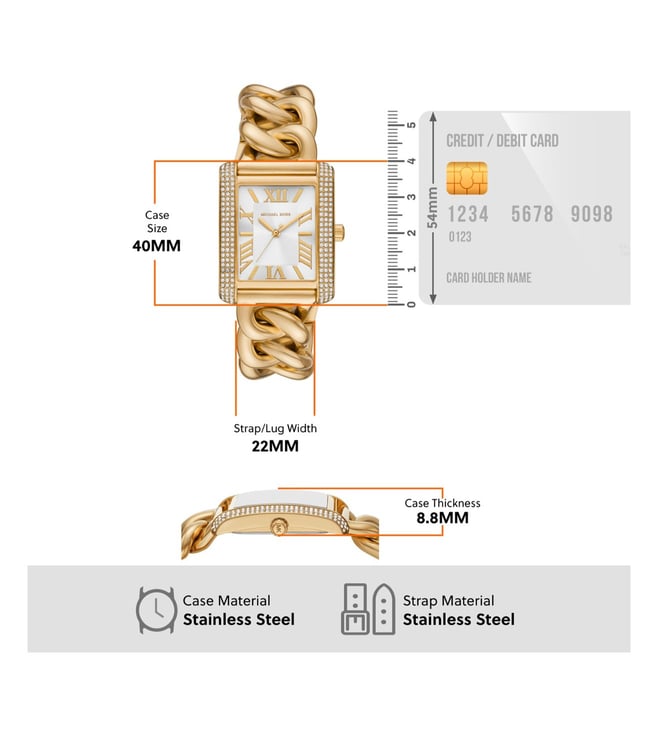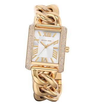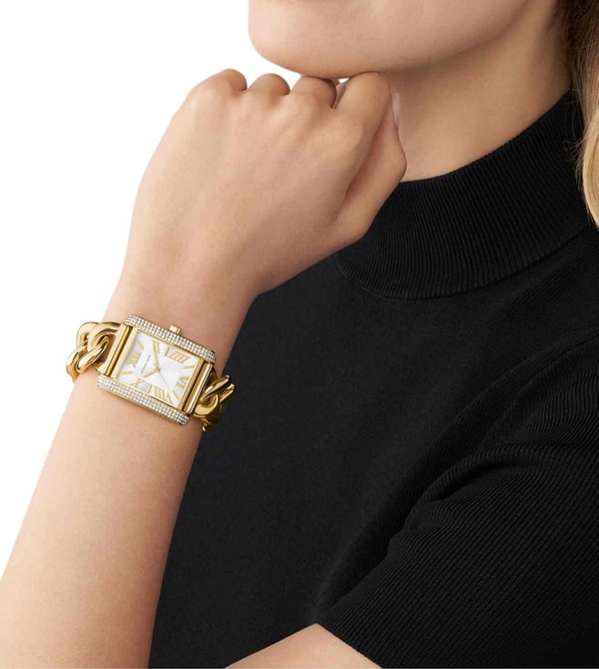 This 40 mm Emery gets a stunning update for the season with a curb-chain bracelet. Featuring a shaped-case with a pave topring, this gold-tone stainless steel watch has the perfect touch of sparkle. This elegant watch is suitable for many occasions.