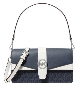 Michael Kors navy blue greenwich convertible medium shoulder bag crafted in coated canvas and polyester featuring snap closure, 1 compartment, inside back zip pocket, outside slip pocket, metal logo, top handle with removable adjustable crossbody strap. Products purchased from Darveys are supported exclusively by the warranty/exchange policies of Darveys and its partner boutiques. Brand owners and their channel partners are not responsible for exchange/warranty services for items purchased through Darveys.