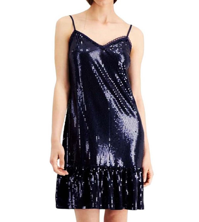 Amp up your wardrobe with this navy blue sequined flounce-hem slip dress from Michael Kors crafted in polyester featuring sequined, sleeveless, flounce-hem and slip.