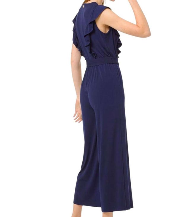 Adorn the modern look with this navy ruffled belted cropped jumpsuit from Michael Kors crafted in polyester/elastane featuring round neck, sleeveless, ruffled details, belted. Products purchased from Darveys are supported exclusively by the warranty/exchange policies of Darveys and its partner boutiques. Brand owners and their channel partners are not responsible for exchange/warranty services for items purchased through Darveys.