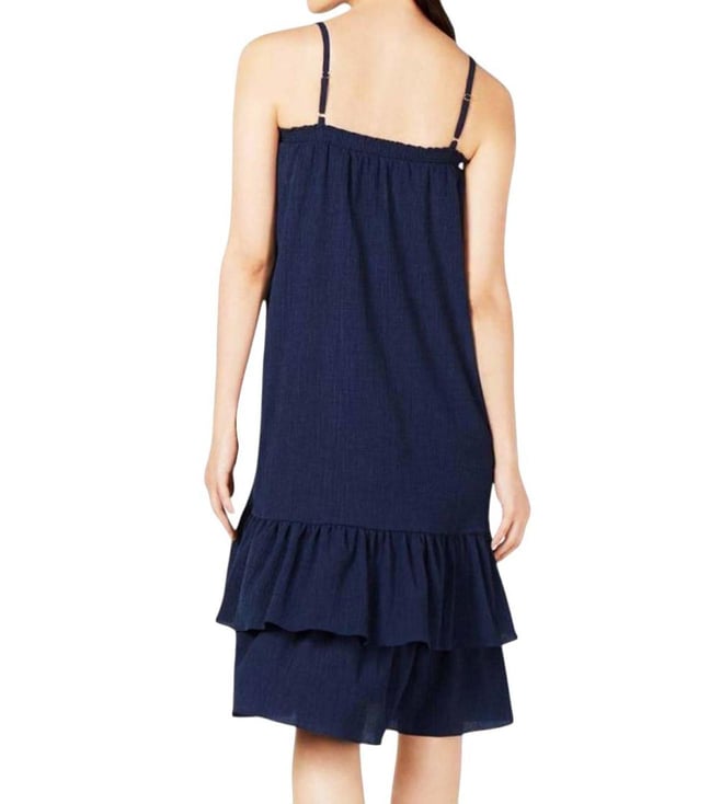 Adorn the modern look with this navy smock neck textured midi dress from Michael Kors crafted in polyester/viscose/nylon/elastane featuring smock neck, midi length, spaghetti strap, sleeveless.