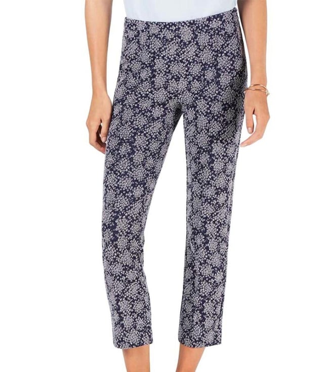 Adorn the modern look with this navy white printed capri cropped pants from Michael Kors crafted in polyester/viscose/elastane featuring all-over print, side zip closure, cropped length.