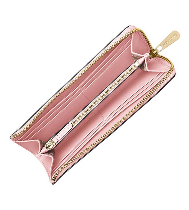 Accessorize perfectly with this pink jet set zip wallet by Michael Kors crafted in leather featuring zip closure, 1 center zip pocket, 8 card slots and logo detailing to give you luxe appeal.