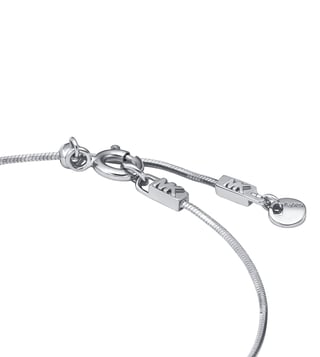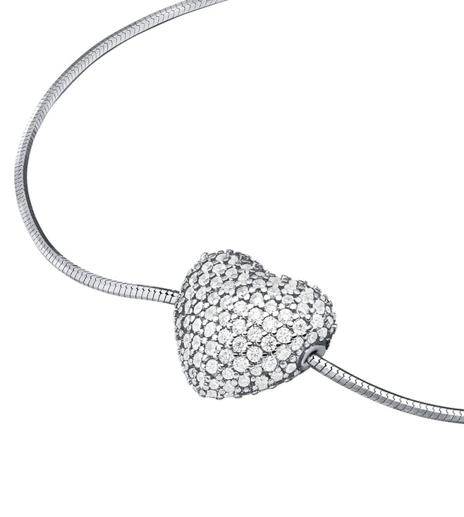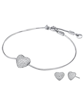 The Kors Love collection, where modern designs intertwine with messages of love. Crafted with care, this charming rhodium plated sterling silver bracelet and stud earring set, is a symbol of affection. These styles boast a heart charm adorned with sparkling cubic zirconia pavé for an extra touch of allure. The bracelet is secured with a spring ring and slider closure, ensuring a perfect fit. This matching set presents a coordinated ensemble that exudes timeless romance and elegance.