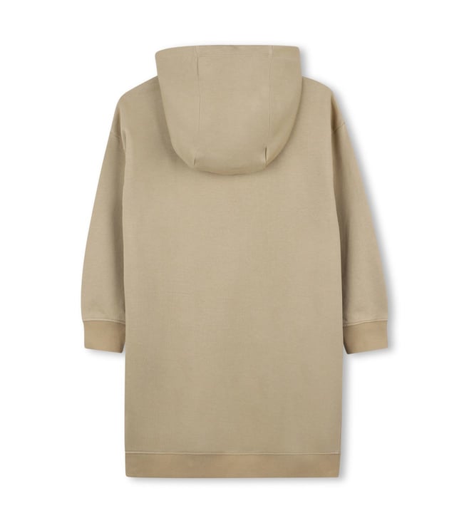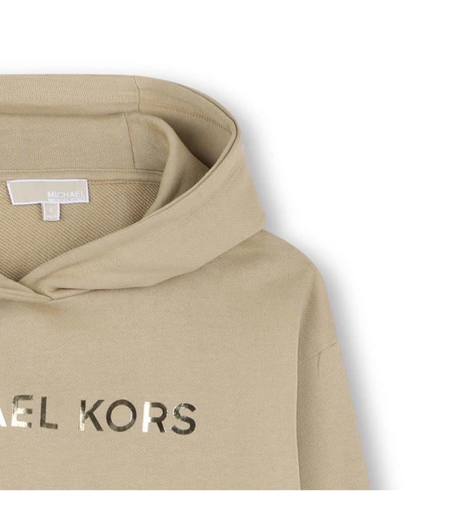 Elevate your casual wardrobe with the Michael Kors Stone Beige Hooded Dress. Made from 100% cotton French terry, this hoodie dress offers both comfort and style. The branded illustration of MICHAEL KORS in gold metallic effect on the front adds a touch of luxury to this everyday essential. Perfect for running errands or meeting friends for brunch, this dress is versatile and effortlessly chic. Stay cozy and fashionable in this must-have piece from Michael Kors.