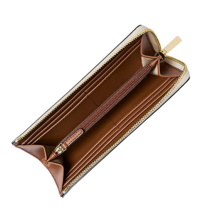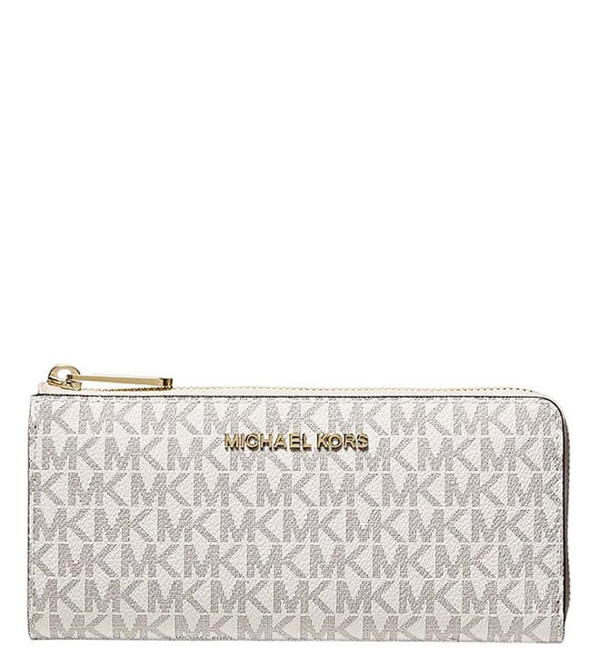 Accessorize perfectly with this vanilla jet set zip wallet by Michael Kors crafted in coated canvas, polyester and polyurethane featuring zip closure, 2 slip pockets, zip pocket, 8 card slots and logo detailing to give you luxe appeal.