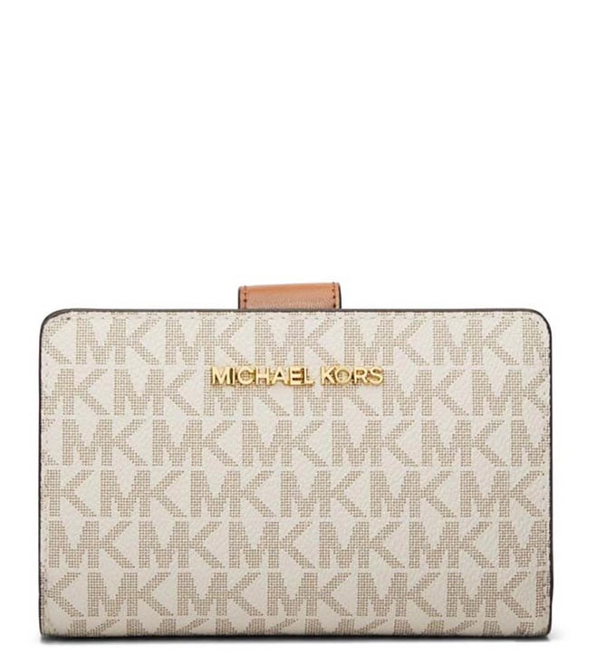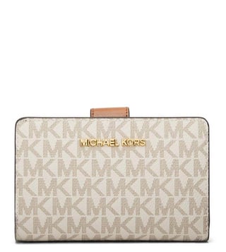 Accessorize perfectly with this off white signature logo wallet by Michael Kors crafted in coated canvas/polyester featuring zip closure, zip pocket, 3 slip pockets, 6 card slots, ID window, front logo.