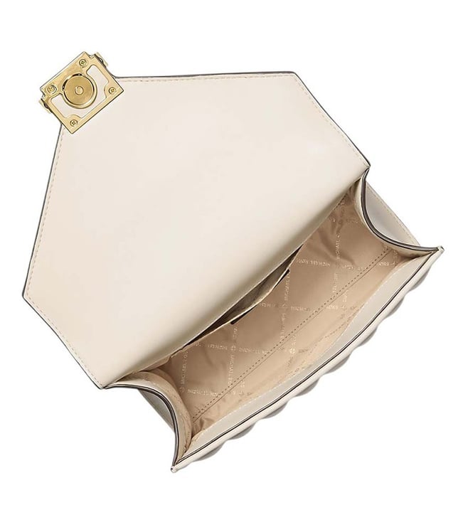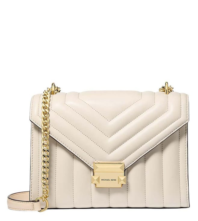 Michael Kors white whitney medium shoulder bag crafted in polyurethane and polyester featuring snap closure, 1 compartment, inside slip pocket, metal logo, convertible chain-link shoulder strap.