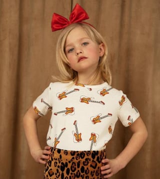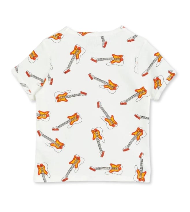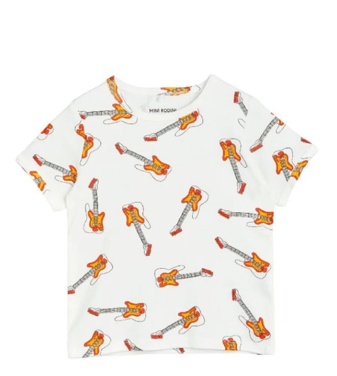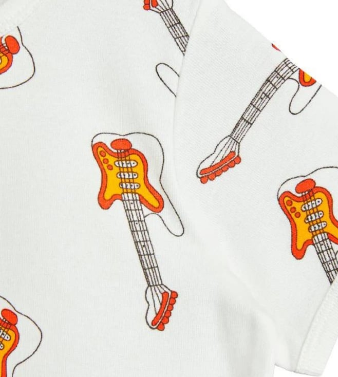 A white half-sleeved organic cotton top for boys and girls by Mini Rodini, with a fun guitar print in red and yellow. Casual and comfortable it is made in soft jersey with a lightly ribbed crew neckline.