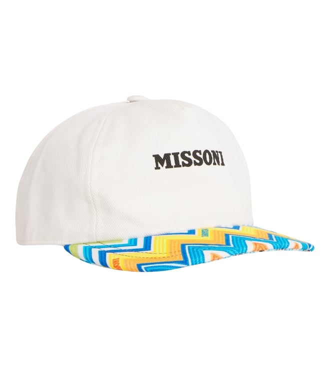 White branded baseball cap for boy and girl by Italian label Missoni, made in soft cotton twill. A stylish accessory to her resort wear look, it features the designer's iconic zigzag pattern on the stiff peak, in shades of blue with yellow and orange. An adjustable velcro strap on the back ensures a comfortable fit. The structured design provides sun protection.