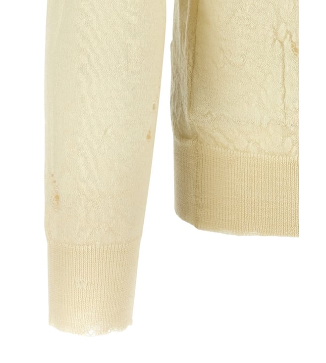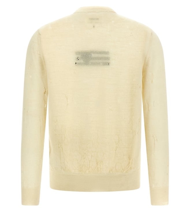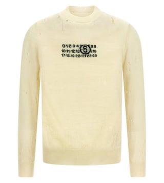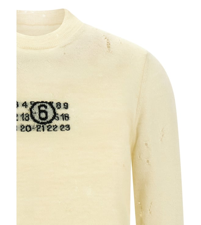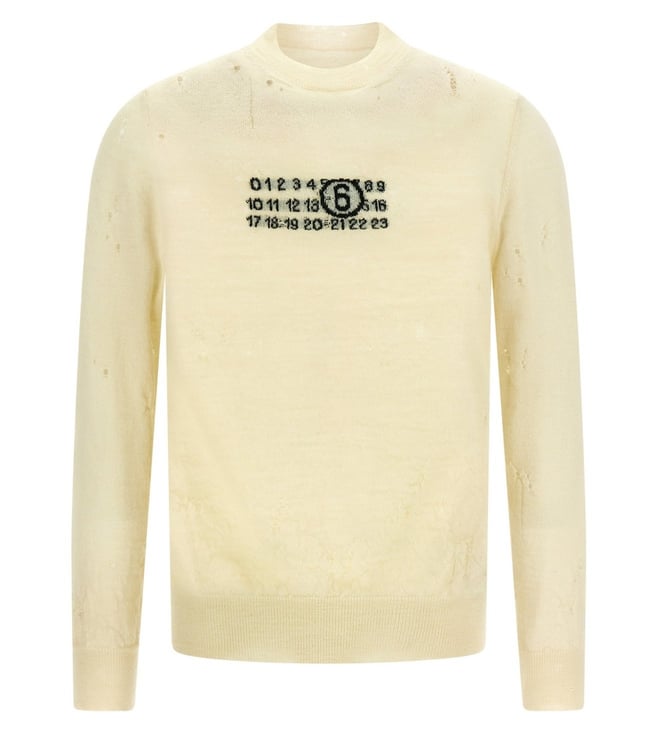 Elevate your style with the MM6 Maison Margiela Beige Graphic Regular Fit Sweater. Distressed wool sweater with front jacquard 'numeric signature mm6' and rips, crew neck, long cuffed sleeves, 'white stitch line' at the back.x000D True to size fit. Products purchased from Darveys are supported exclusively by the warranty/exchange policies of Darveys and its partner boutiques. Brand owners and their channel partners are not responsible for exchange/warranty services for items purchased through Darveys.