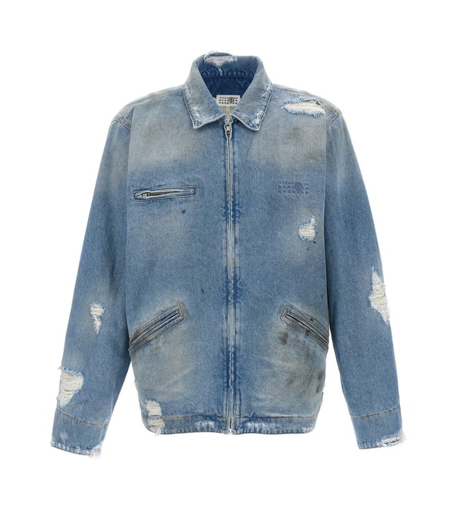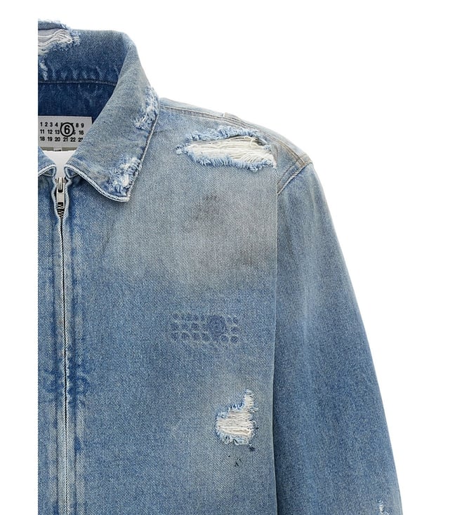 Elevate your style with the MM6 Maison Margiela Blue Used Effect Distressed Denim Jacket. Usedeffect cotton denim jacket with uncorks and paint stains, embossed 'numeric signature mm6' and front zip closure, collar, long sleeves, striped cotton lining, 'white stitch line' at the back.x000D The uneven appearance between garment and garment is to be considered a quality and not a defect. True to size fit.