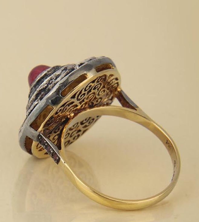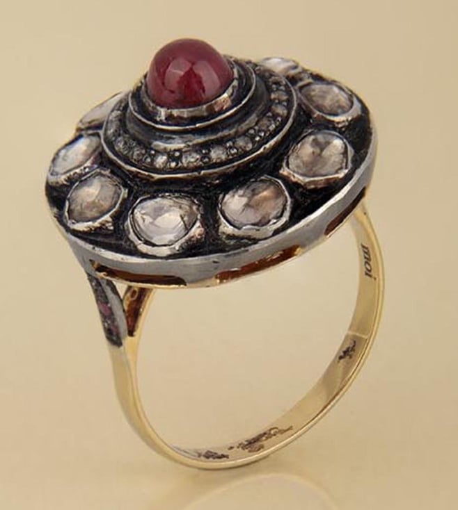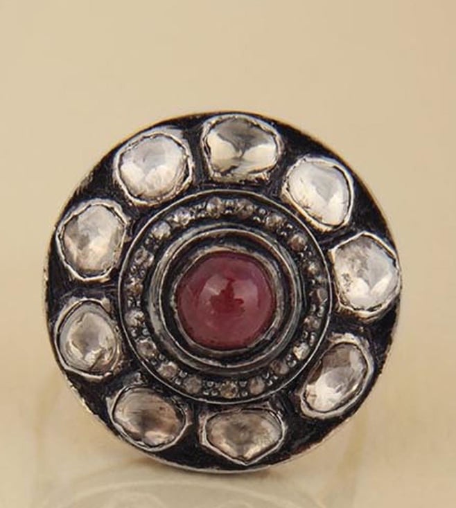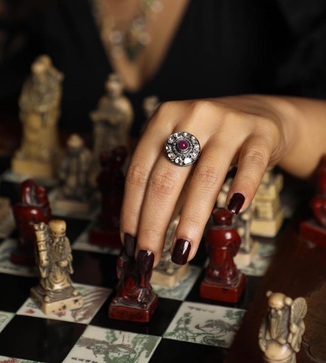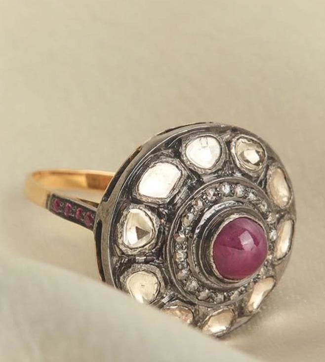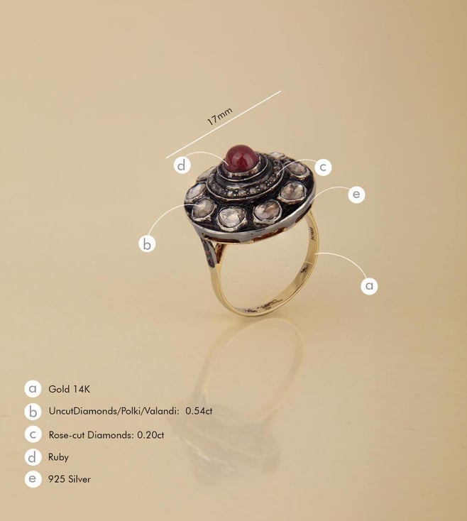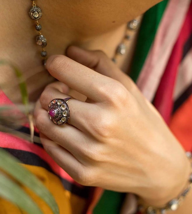 This design ideology welcomes the imperfect and the edgy. A minimal spin on the traditional floral motif and a signature pop of colour embodies this ring from the Khoob collection. It is crafted in 14 kt gold and 925 silver and highlighted with emerald and tsavorite at its heart surrounded with 0.20ct rose-cut diamonds and petals of 0.54ct uncut diamonds. Disclaimer: All other items in the image are only for display purposes and will not be a part of the delivery content.