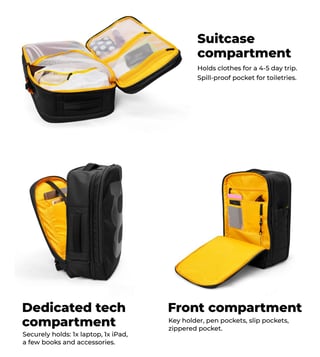 Meet the Em Travel Backpack, designed to pack everything. Almost. With a 45 L capacity this backpack is perfect for week-long getaways. For when you want to carry a cabin luggage worth of items, but also don¿t want to rolley-rolley luggage. This backpack is air friendly, road friendly and sea friendly.