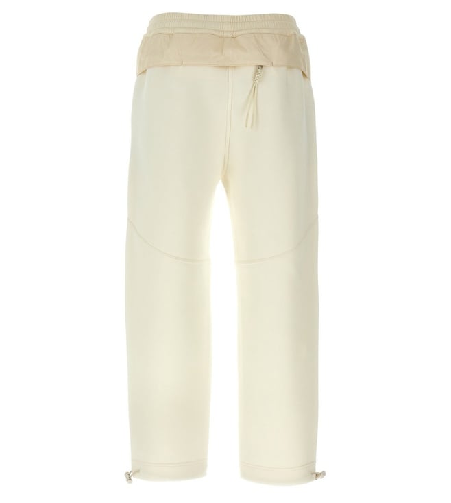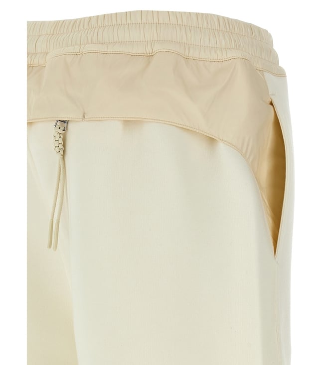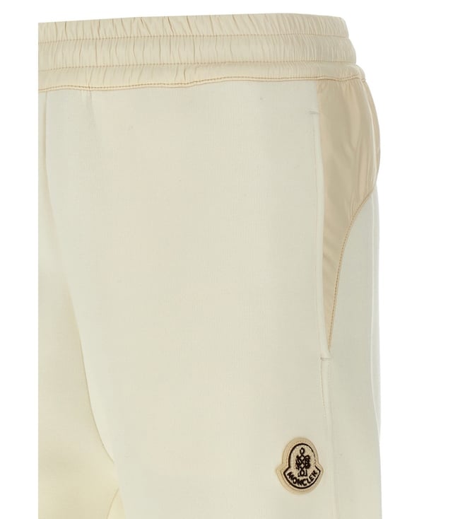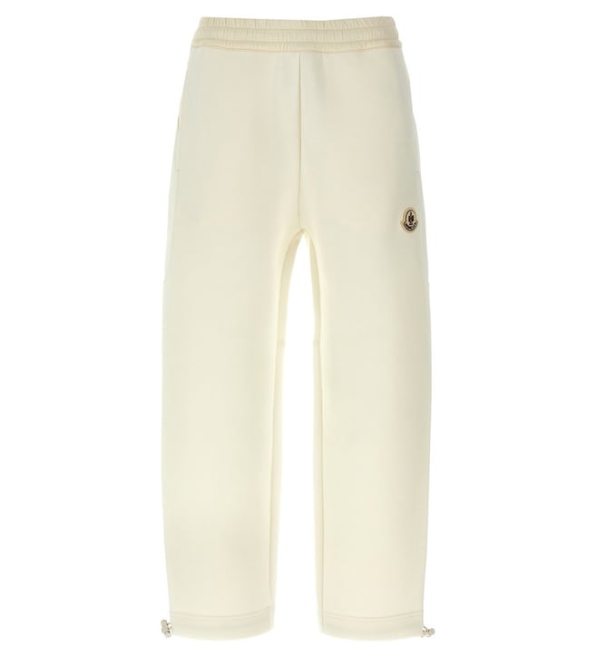 Elevate your wardrobe with the Moncler Off White Loose Fit Trackpants. Designed with cotton and neoprene blend joggers with nylon laqu inserts, adjustable drawstring elastic waistband, pockets, front terry anno del serpente logo patch, ankle drawstring. true to size fit, these trousers combine comfort and sophistication for everyday wear. Products purchased from Darveys are supported exclusively by the warranty/exchange policies of Darveys and its partner boutiques. Brand owners and their channel partners are not responsible for exchange/warranty services for items purchased through Darveys.