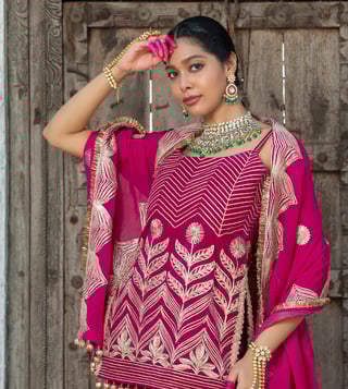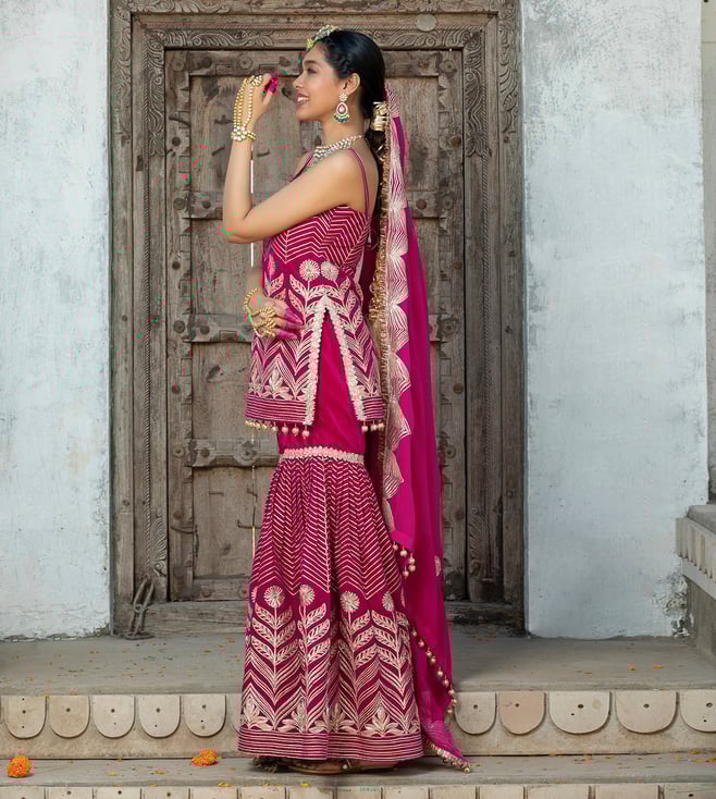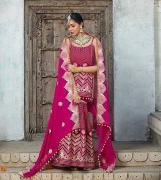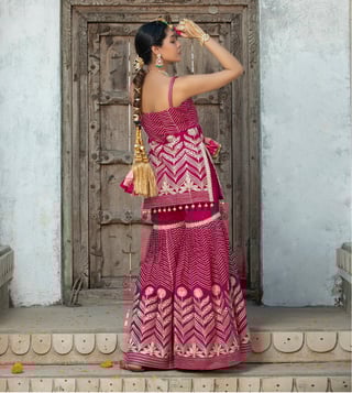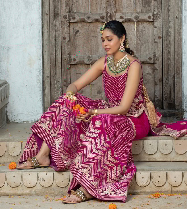 A chic spaghetti strap short gotta embellished velvet kurta and sharara set. The voluminous pleated sharara is perfect for festivities. Paired with a soft organza dupatta embellished with gotta embroidery on borders and gotta tikkis all over along with playful gotta tassels. Perfect for festive occasions and royal weddings, this regal set combines traditional Rajasthani artistry with Punjabi heritage of opulence. Style: Fitted.