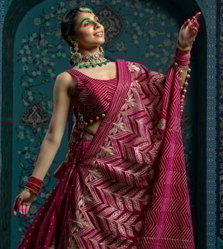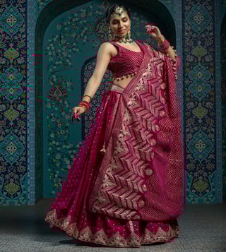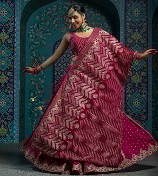Designer Lehenga set with velvet blouse & cape adorned with delicate gotta work, creating a radiant shimmer that exudes elegance. The lehenga is intricately designed with gotta embroidery between the panels and along the hem, adding richness to its traditional appeal. The cape is finished with elegant gotta tassels, enhancing its fluidity and movement. Lehenga skirt comes with an attached cancan for the fuller festive look. This lehenga set is a perfect fusion of regal grandeur and contemporary style, making it ideal for weddings or your grand celebrations. Style: Fitted