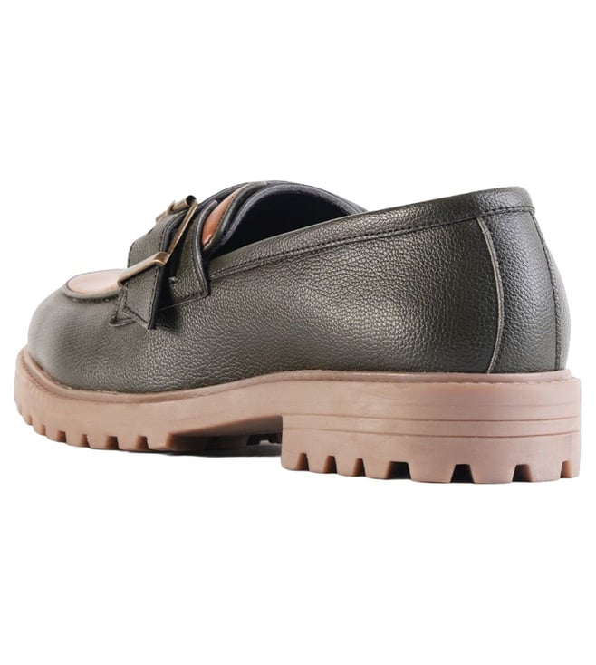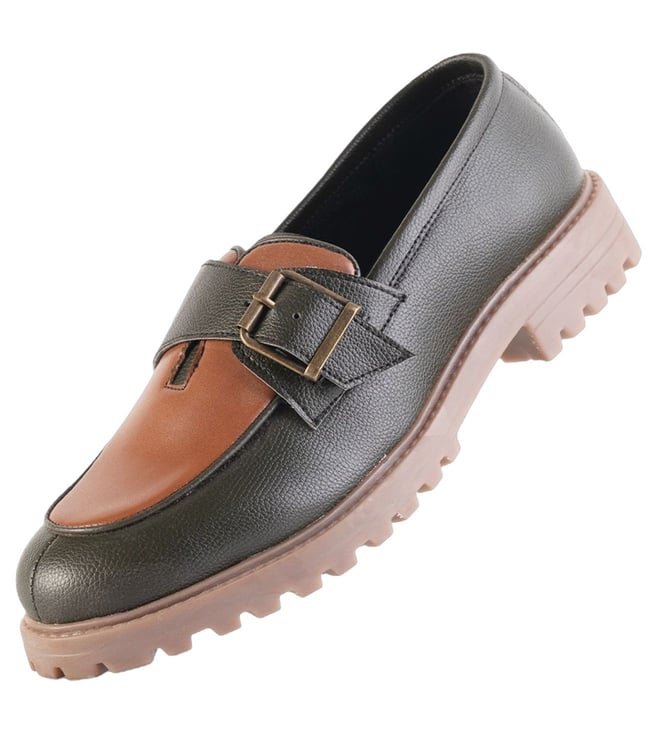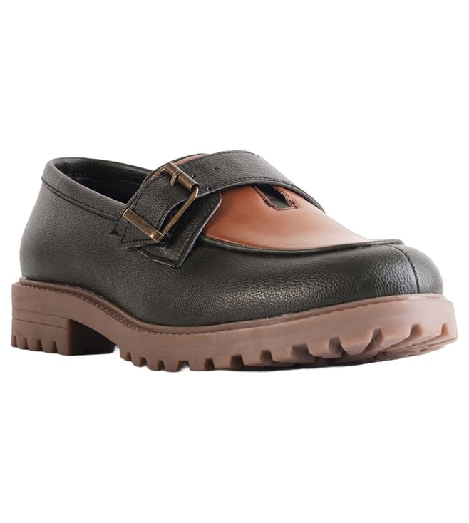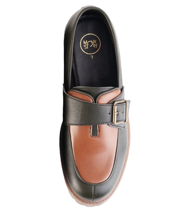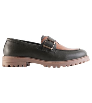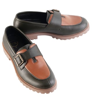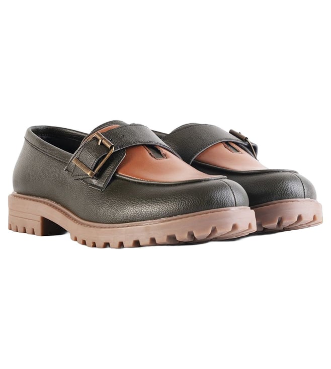 Class meets character. The¿Monkstory Cosmopolitan Buckled Loafers¿are a striking blend of dapper sophistication and rugged edge. With a textured olive-green vegan leather body, contrasting tan vamp, and a bold metallic buckle, these loafers redefine smart casual. All this rests on a chunky tan ridge sole that¿s made for movement. It¿s the kind of shoe that demands attention without raising its voice.