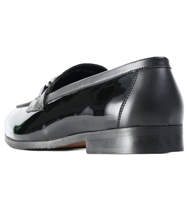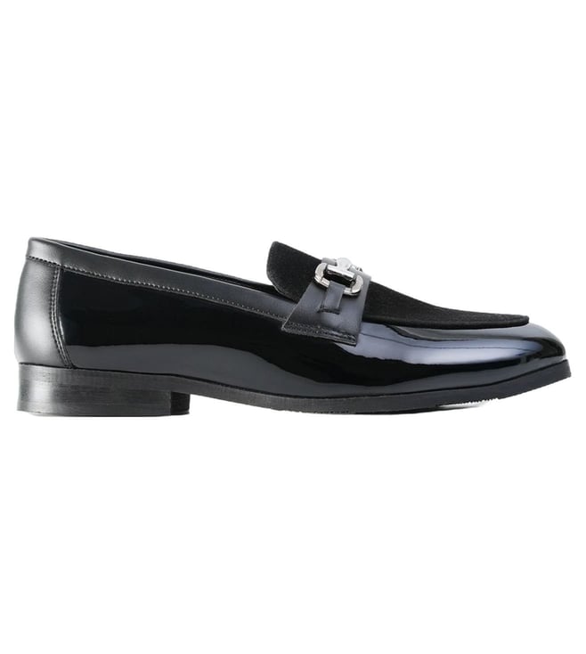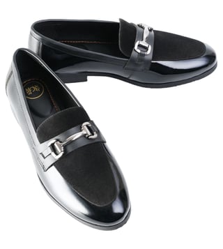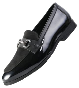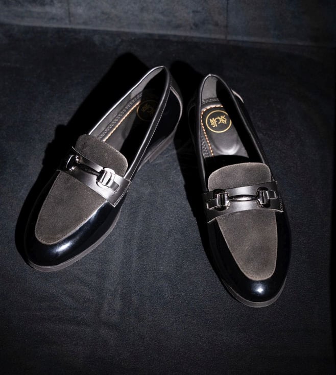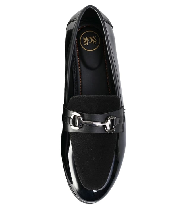 Welcome to the spotlight. These black patent and suede horsebit loafers by Monkstory are designed for those who arrive in style and leave an impression. With a bold blend of high-shine vegan patent leather and smooth vegan suede, the dual-texture upper is adorned with a sleek metallic horsebit accent a nod to timeless elegance. Whether it¿s a black-tie evening or a red-carpet-worthy appearance, these loafers are made to stand out without shouting.