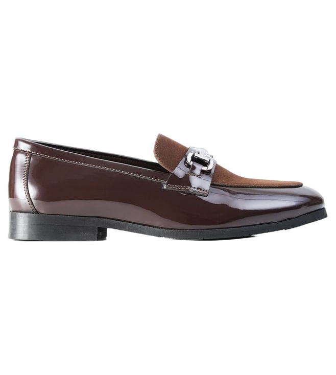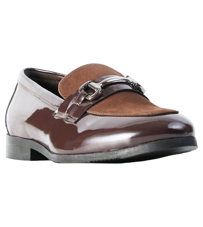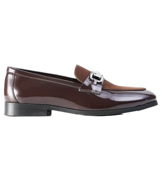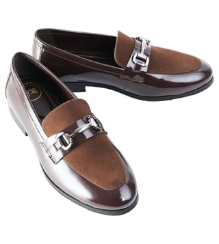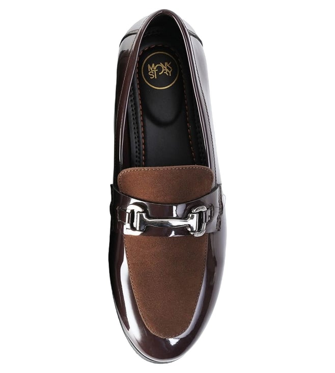 Dress codes were made to be redefined. These brown Monkstory loafers blend the richness of polished vegan patent leather with the softness of tan suede for a luxe contrast that speaks volumes. Finished with a silver horsebit on the vamp, these loafers are for those who don¿t just dress up they elevate the room. Add a glass of whiskey and you are unstoppable.