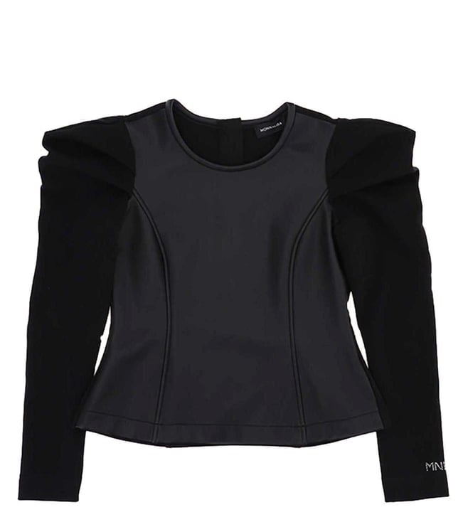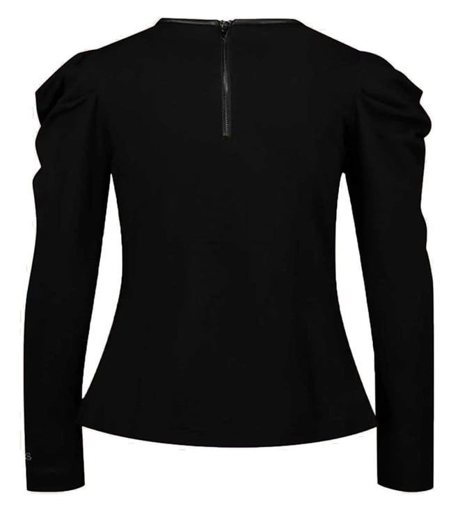 This leather-look corset top from Monnalisa Kids makes kids look so fit. It features gathered puff sleeves at the shoulders and back centre zip. The round neck adds to its appeal. This party wear top goes so well with fitted high waist pants.