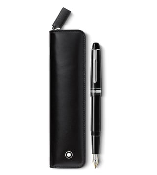 Set comes with the Montblanc Meisterst ck classique platinum-coated fountain pen and Montblanc 1 pen pouch with zip. The cap and barrel are crafted in black precious resin featuring the white Montblanc emblem inlaid in the cap top. Pouch, made of full-grain calfskin, jacquard lining with Montblanc brand name, with compartment for 1 writing instrument the size of Meisterst ck Classique or Le Grand, Montblanc emblem with palladium finish ring.