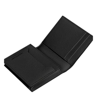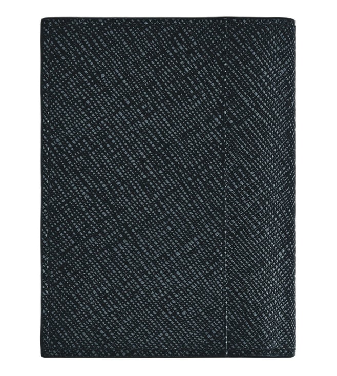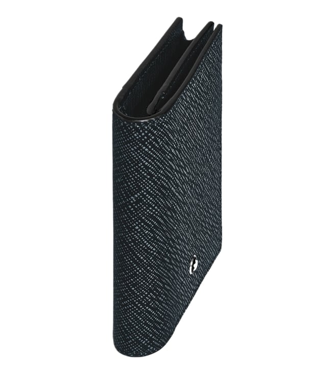 Compact yet versatile, this card holder is crafted from two-tone embossed sartorial leather in a sophisticated combination of blue and black. Designed with functional details inside and out, it features three credit card slots, a business card compartment, and an additional pocket on the interior, while the exterior includes an extra slot for a fourth credit card.