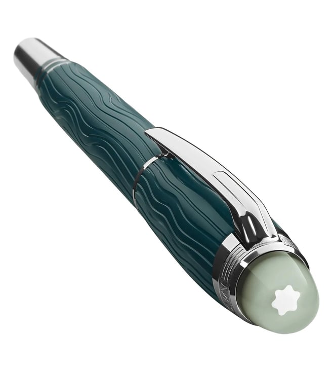 The StarWalker PolarGreen collection brings the beauty of the Northern Lights to life. On Earth, humans can gaze skyward and be transported to realms of wonder as they witness their grand spectacle. The dome on the cap top is made of transparent resin and glows in low light, recalling the enchanting dancing auroras of the night sky. The wave pattern on the dark green precious resin of the cap and barrel admirably captures the spectral sheen of the lights, and the matte finish accentuates the seemly reflections. The fountain pen features platinum-coated fittings.