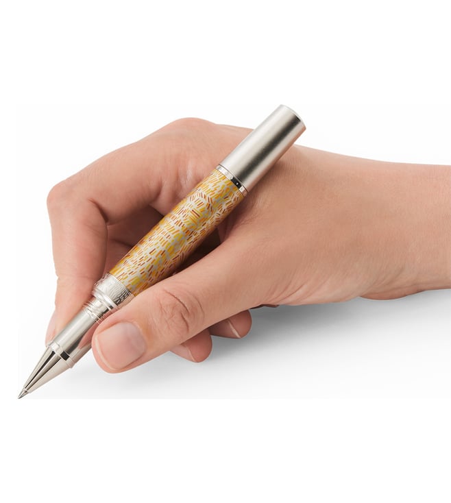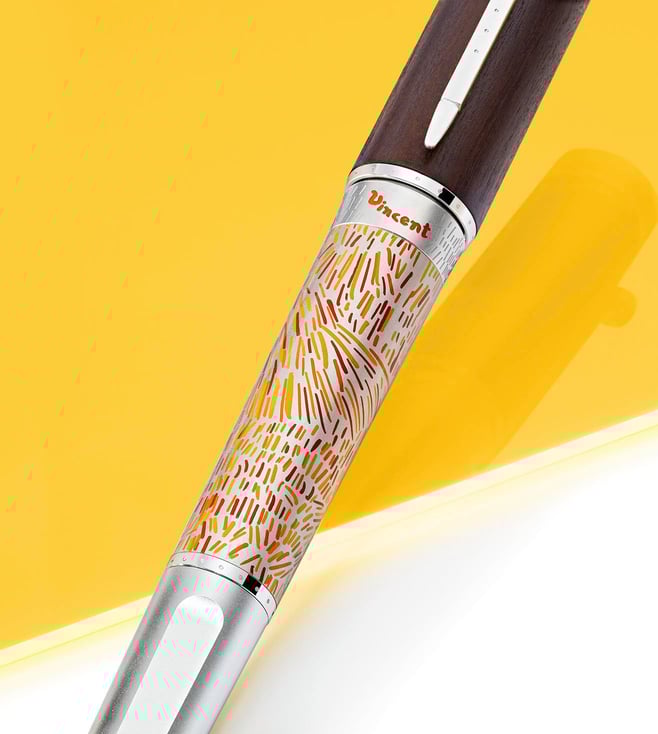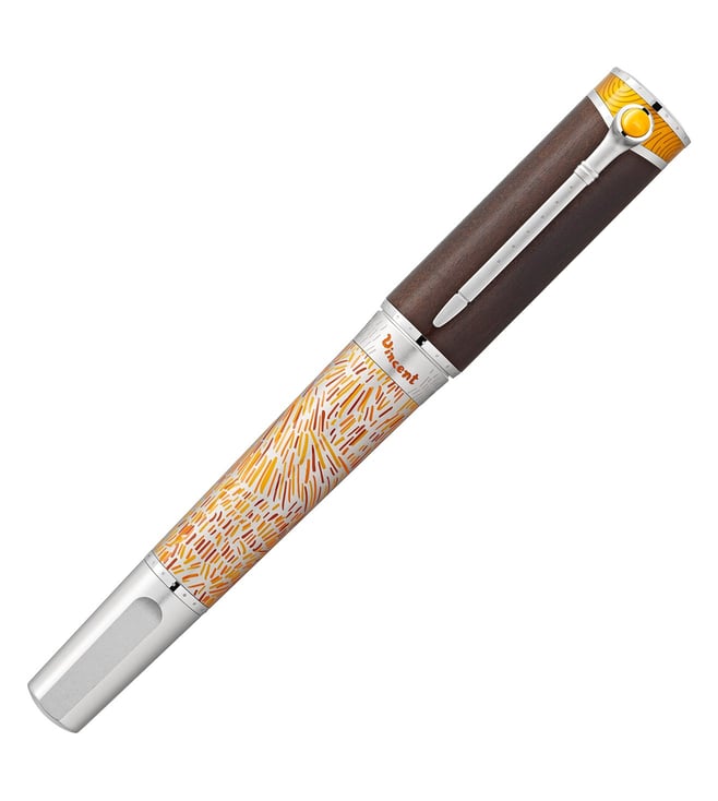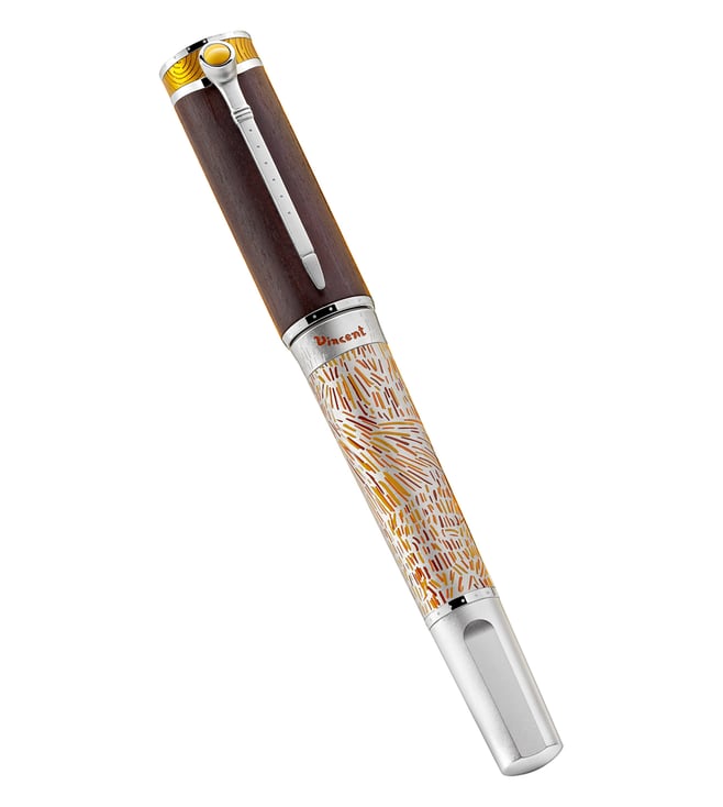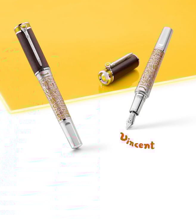 Montblanc celebrates Vincent van Gogh, one of the most popular painters of the late 19th century with this limited edition fountain pen. This edition especially emphasizes one of his most famous paintings, 'Sunflowers'. Engraved 1888 on the barrel ring, next to Vincent's signature in bright orange, recalls the year when he moved to Arles. While the barrel is decorated in shades of yellow and orange reflecting the sun-drenched landscapes of southern France. A Japanese woodcutting knife inspires the overall shape while a Montblanc emblem in precious resin crowns the wooden cap.