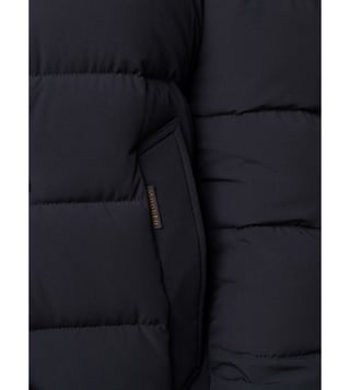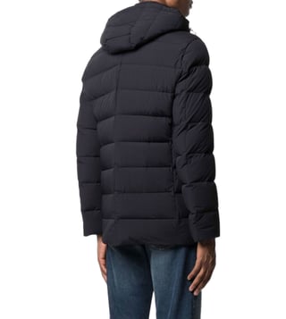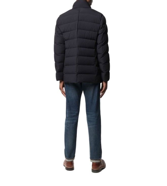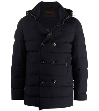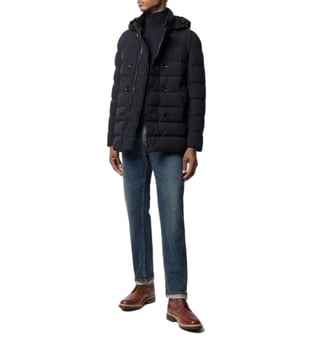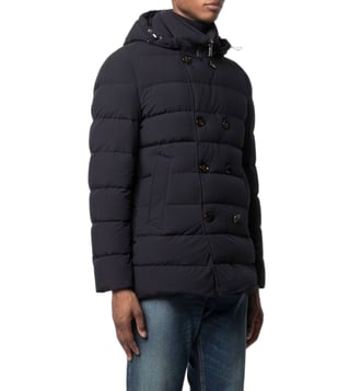 Dark blue high neck detachable hood off-centre front button fastening two side slit pockets long sleeves. Products purchased from Darveys are supported exclusively by the warranty/exchange policies of Darveys and its partner boutiques. Brand owners and their channel partners are not responsible for exchange/warranty services for items purchased through Darveys.