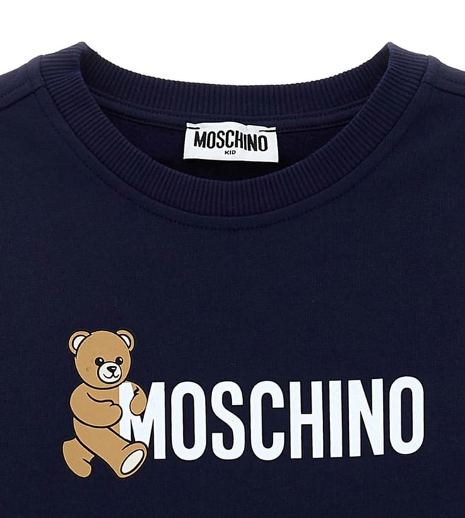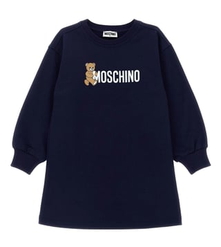 Introducing the Moschino Girls Blue Teddy Bear Logo Printed Comfort Fit Dress, a must-have for your little fashionista. This adorable dress features a charming blue teddy bear logo print that is sure to capture hearts. The comfort fit design ensures all-day wearability, perfect for active little ones. Made with high-quality materials, this dress is not only stylish but also durable, making it a versatile addition to any wardrobe. Let your little one showcase their unique style with this playful and chic dress from Moschino.