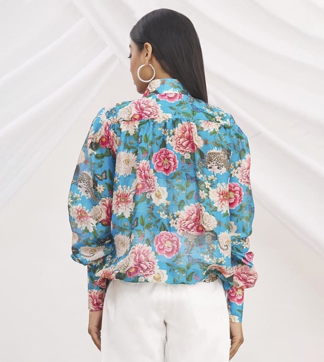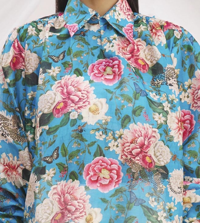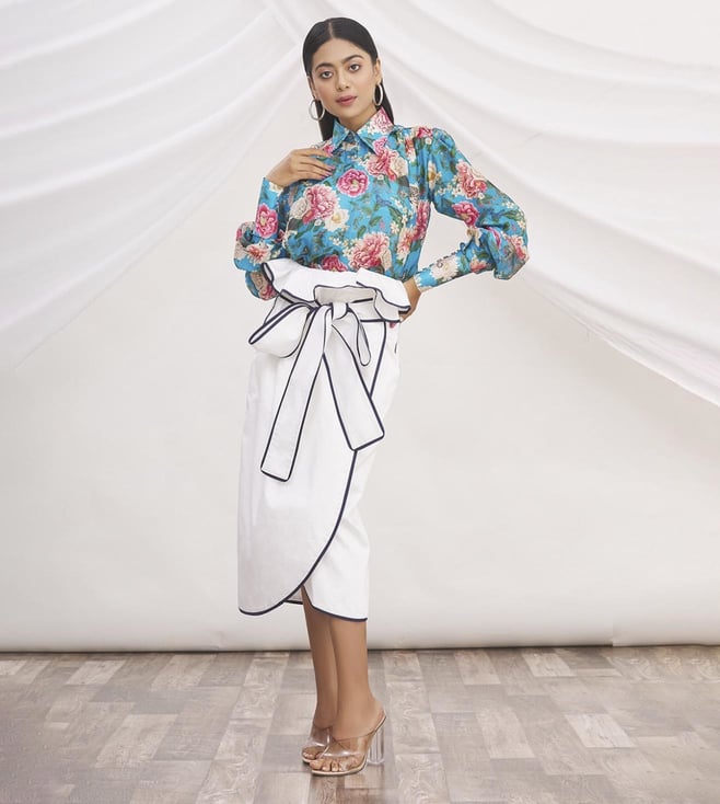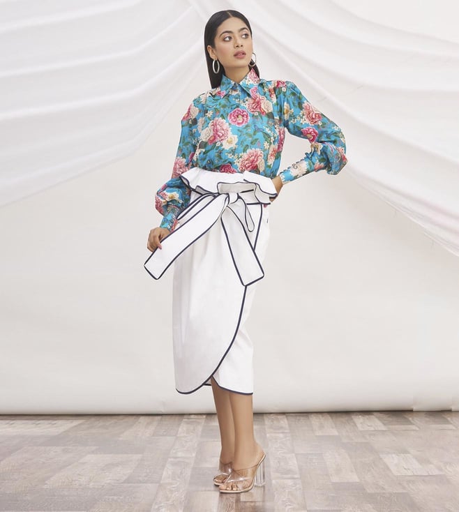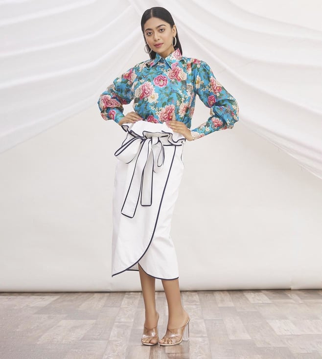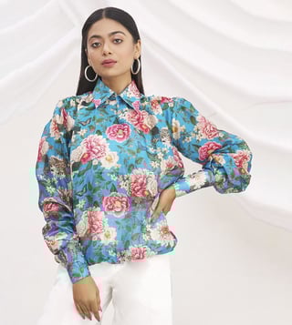 Deck up your wardrobe with this top and skirt set. The top comes with all-over floral print, collar and stylised sleeves. It is finished with an elasticated hem. It is crafted from cotton satin. Wear it for that uber glam look. Disclaimer: Product colour may slightly vary due to photographic lighting sources. Country of Origin - India.