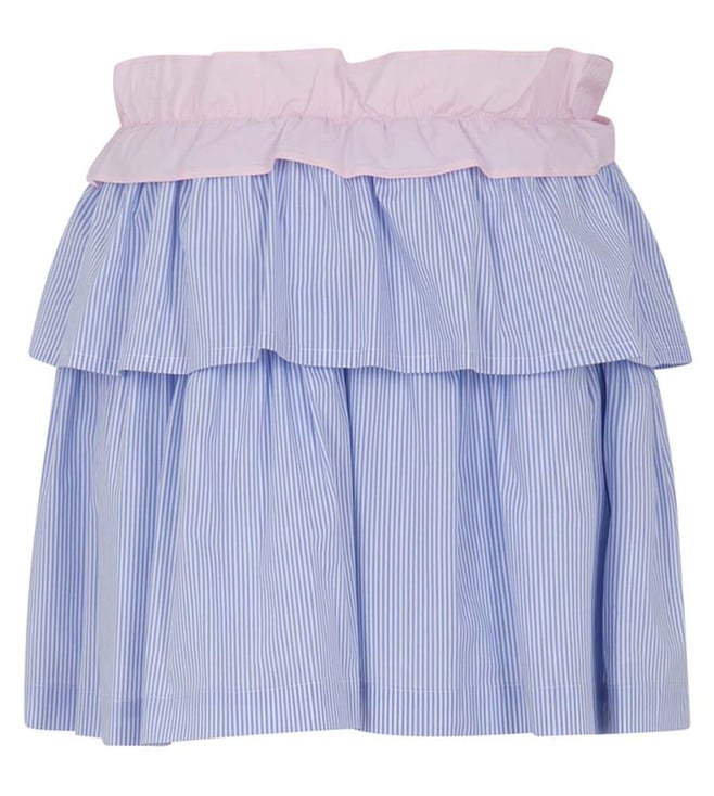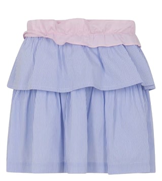 Elevate your little girls wardrobe with the MSGM Blue Printed Fitted Skirt. Designed by Italian fashion house MSGM, this skirt features a beautiful blue and white striped print in a tiered layered design for a full and flared silhouette. Made from lightweight cotton poplin with a part voile lining, this skirt is perfect for warm weather. The elasticated waistband with a frilled trim adds a touch of femininity, while the embroidered micro logo showcases the designers signature style. Chic and comfortable, this skirt is a must-have for any stylish young fashionista.