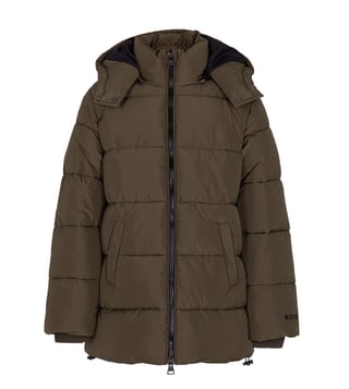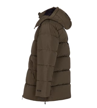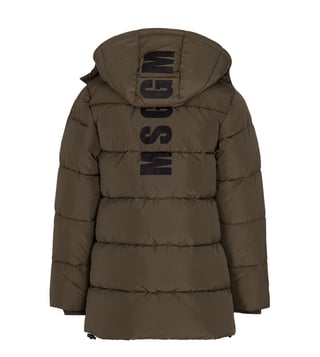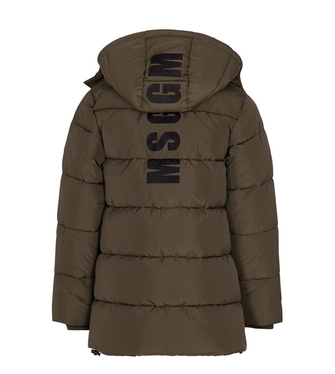 Stay warm and stylish this season with the puffer jacket by the Italian brand MSGMh. It has logo prints on the back, hood and cuffs for a signature look. Warmly padded with a silky lining, it has ribbed cuffs and a toggle-adjusting drawstring hem for a comfortable fit. The detachable hood is fixed on with a zipped and secured under the chin with branded poppers. The jacket fastens with a two-way zipped on the front and has handy popper-fastening pockets.