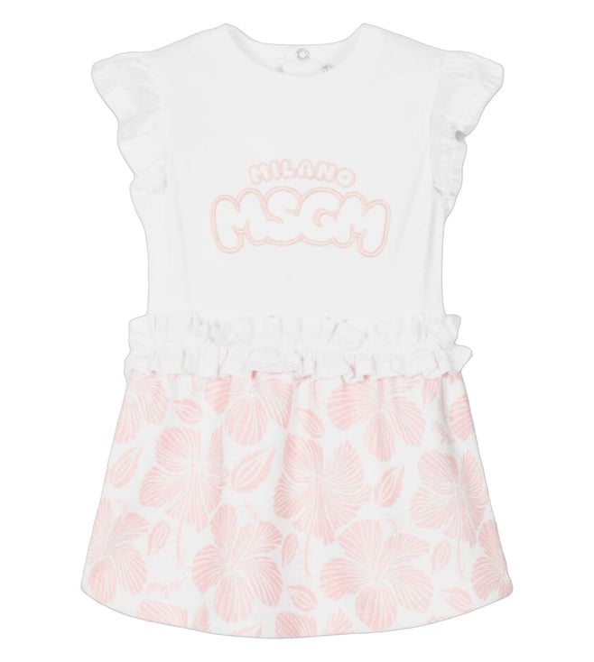 Dress your little princess in style with the MSGM Kids Pink Floral Printed Regular Fit Dress. This pretty white and pink cotton dress features a lightweight jersey bodice with an embroidered pink logo, poplin frills, and a matching waistband with a gathered skirt in soft sweatshirt jersey. Perfect for special occasions or everyday wear, this dress is both comfortable and chic. Your little girl will love twirling in the pink flowers and logos patterned on the skirt. Add a touch of Italian flair to her wardrobe with this adorable dress by MSGM Kids.