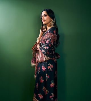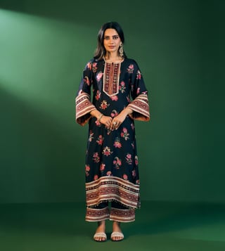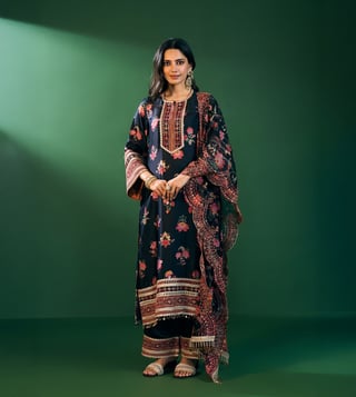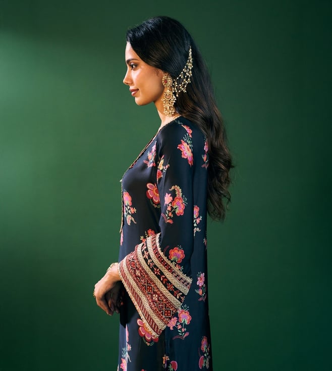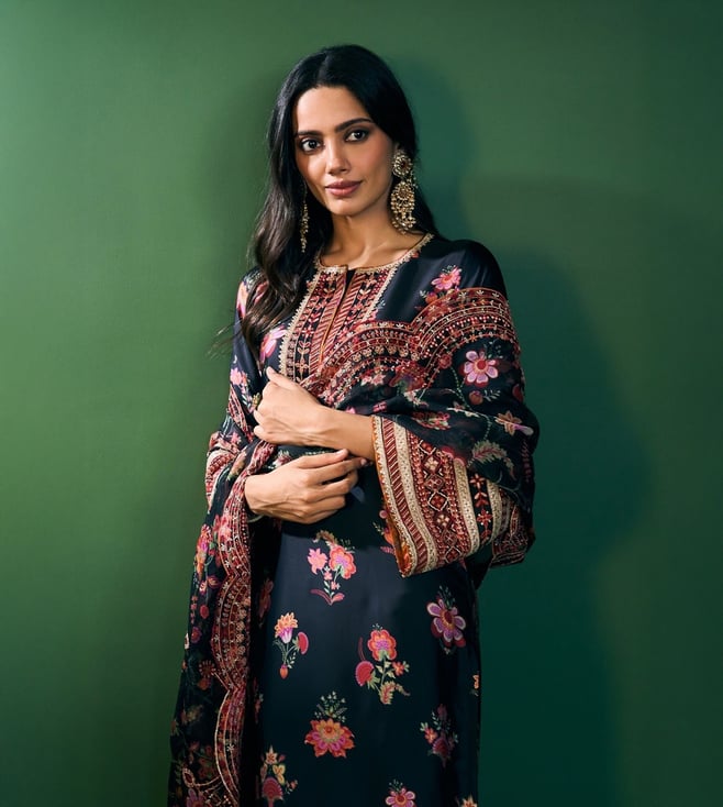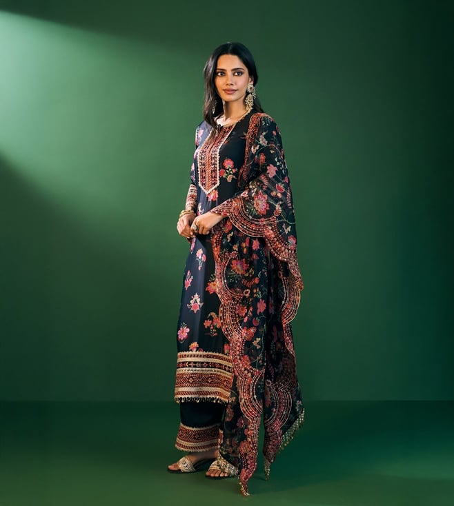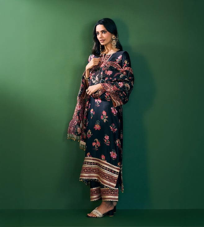 Refined, Bold, And Eternally Classic The Ovia Kurta Set In Black Print Brings Together The Richness Of Cupro Satin And The Lightness Of Organza. The Straight Silhouette Is Adorned With Vibrant Floral Patterns And Intricate Embroidered Borders That Add A Festive Charm. Styled With Matching Pants And An Organza Printed Dupatta Featuring Scalloped Lace Edges, Its The Quintessential Festive Look For Celebrations That Stretch From Day To Night.