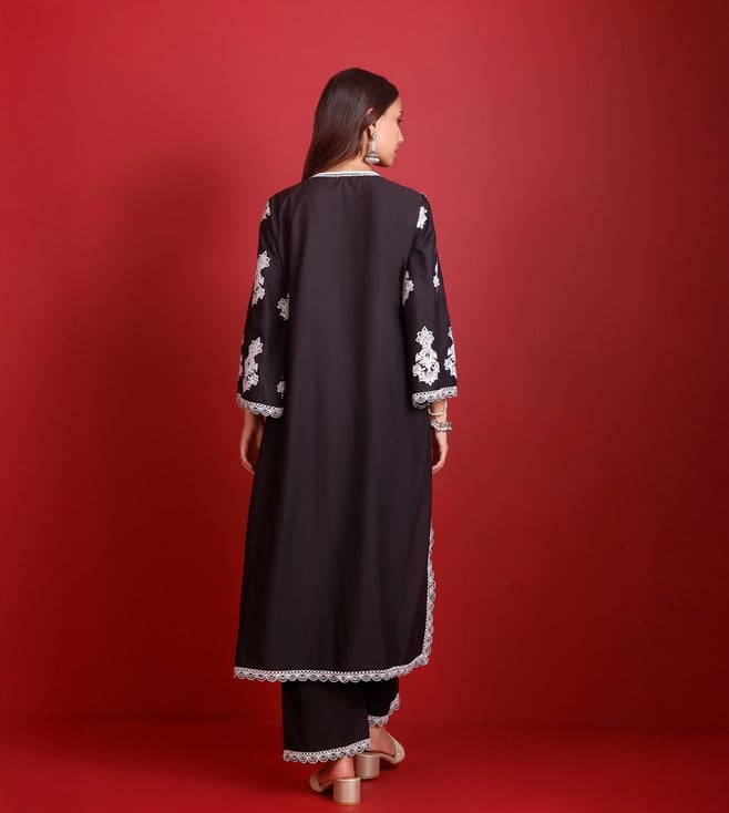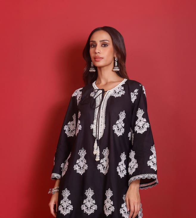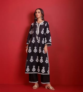 Sophisticated And Versatile, The Rimi Kurta Set In Black Embodies Effortless Elegance. The Cotton Fabric Is Embroidered With Intricate White Motifs That Create A Striking Contrast. Styled With Tonal Pants And A Matching Cotton Dupatta Edged With Lace, This Set Is Your Go To For Intimate Evening Celebrations And Festive Get Togethers.